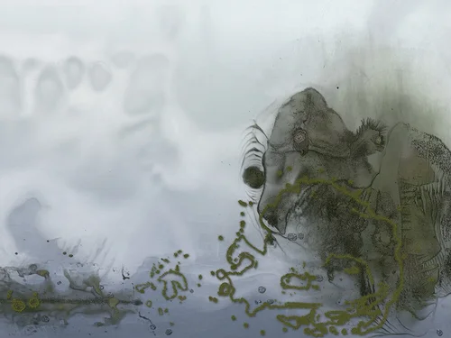 The work from this series embodies a coalescence between drawing, painting, scanography, photography, computer programming, and digital painting/compositing/effects, with occasional inclusion of 3D graphics. The imagery is intended to loosely connote landscape, with allusions to both microscopic and macroscopic spaces, blurring the line between the two, creating environments that are both familiar and mysterious.